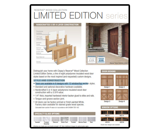 Distinguish your home with Clopay’s Reserve® Wood Collection Limited Edition Series, a line of eight polystyrene insulated wood door styles based on the most inspired (and requested) custom designs. Eight carriage house designs, available in multiple wood species and top section/window panel designs that can be mixed and matched.